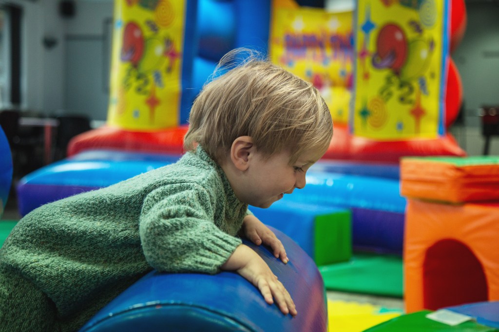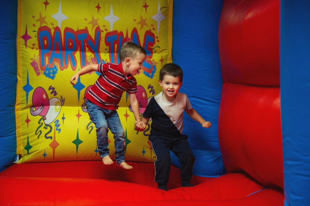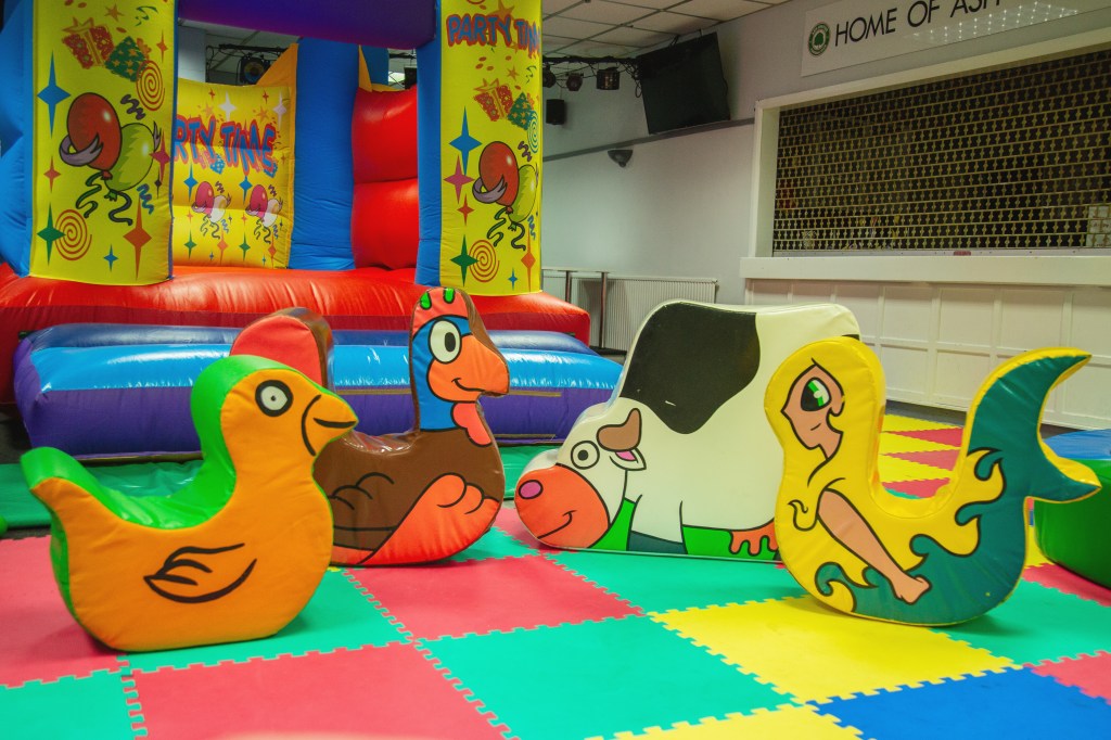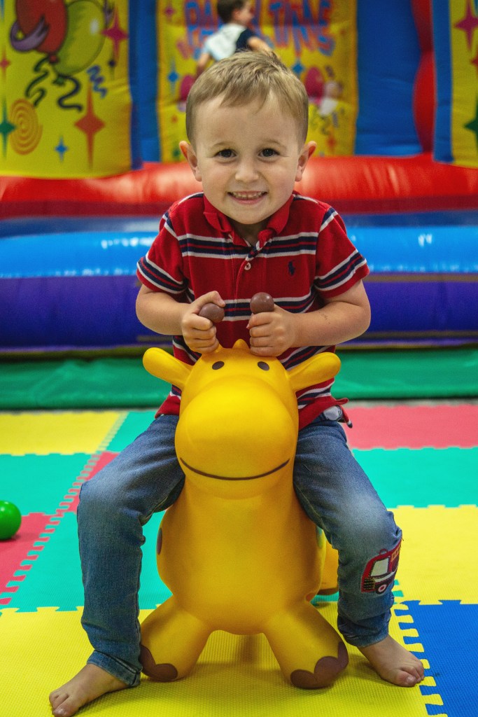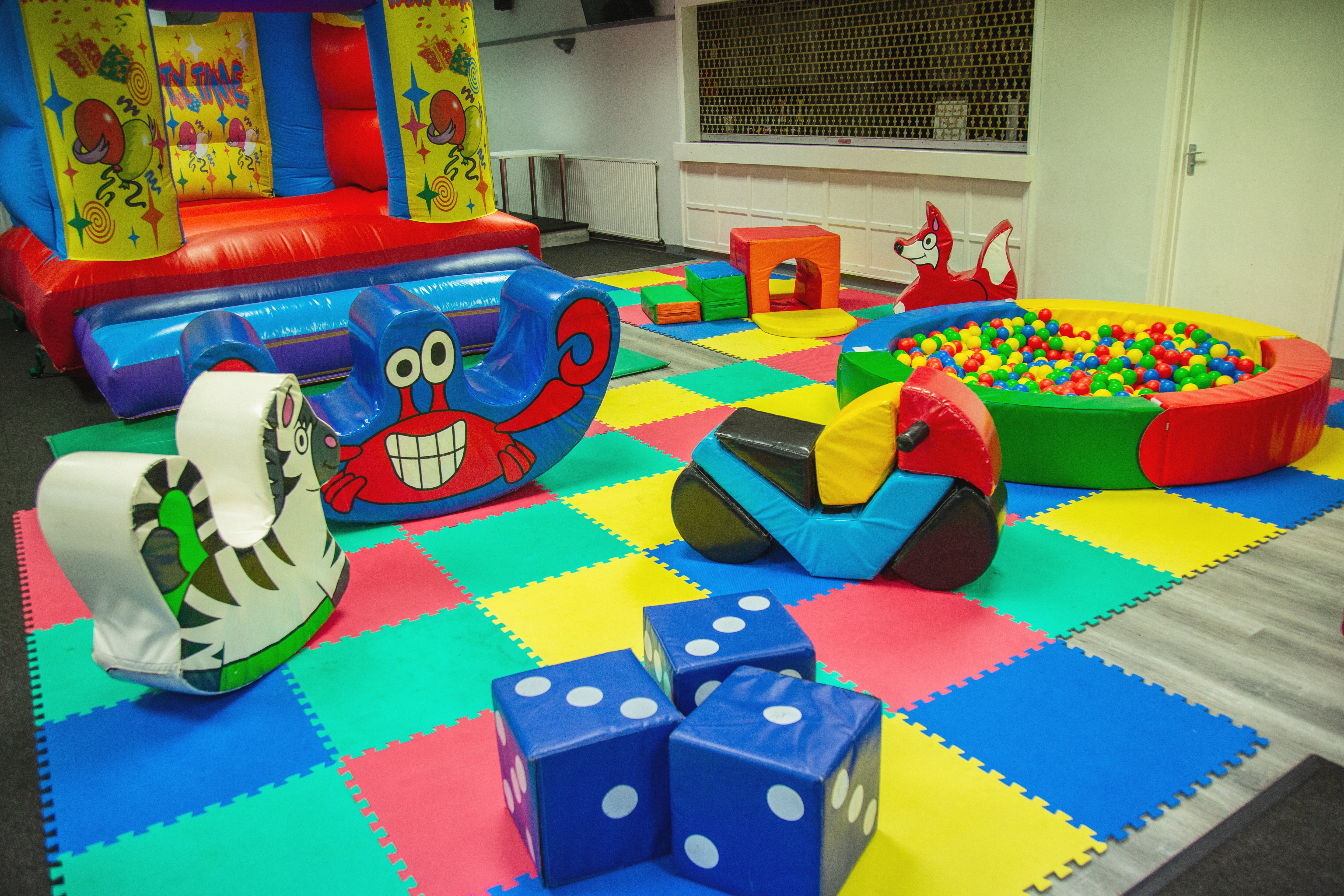 bouncy castle, full soft play setup, ball pit, 4 animal hoppers, 2 ride ons, play pit with shapes. picnic table, themed backdrop, balloon arch and themed props.